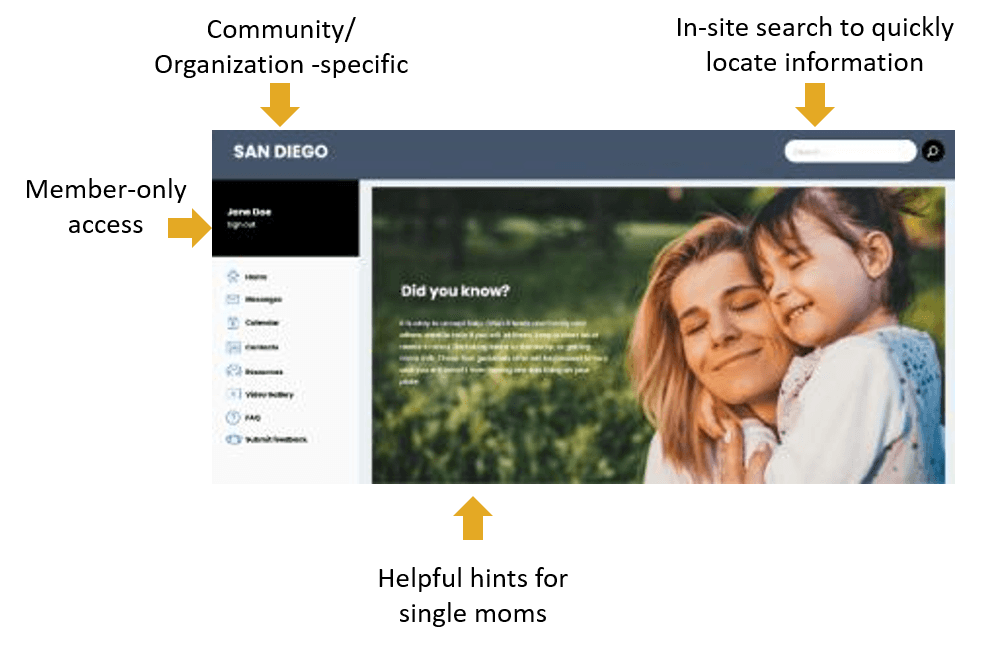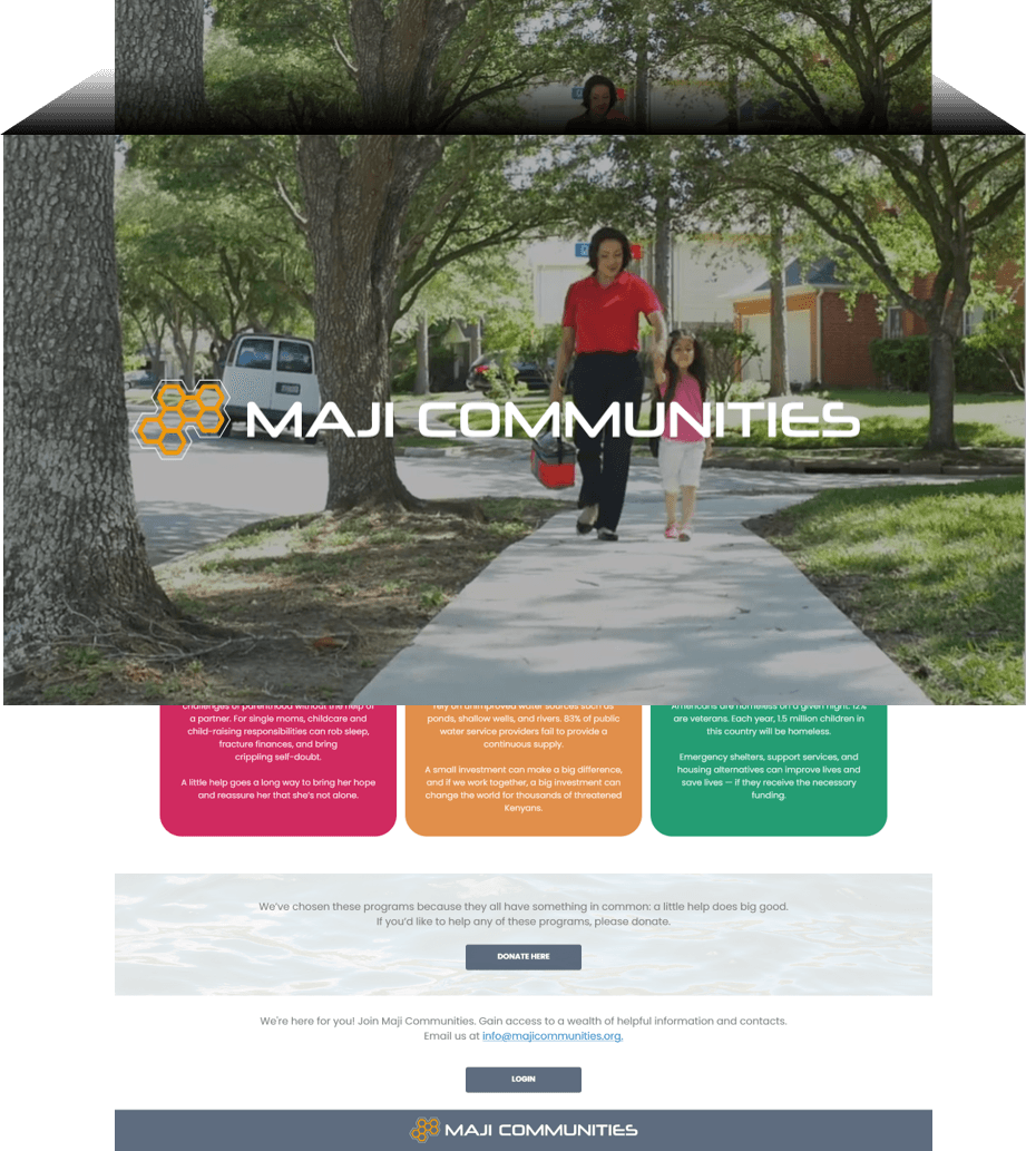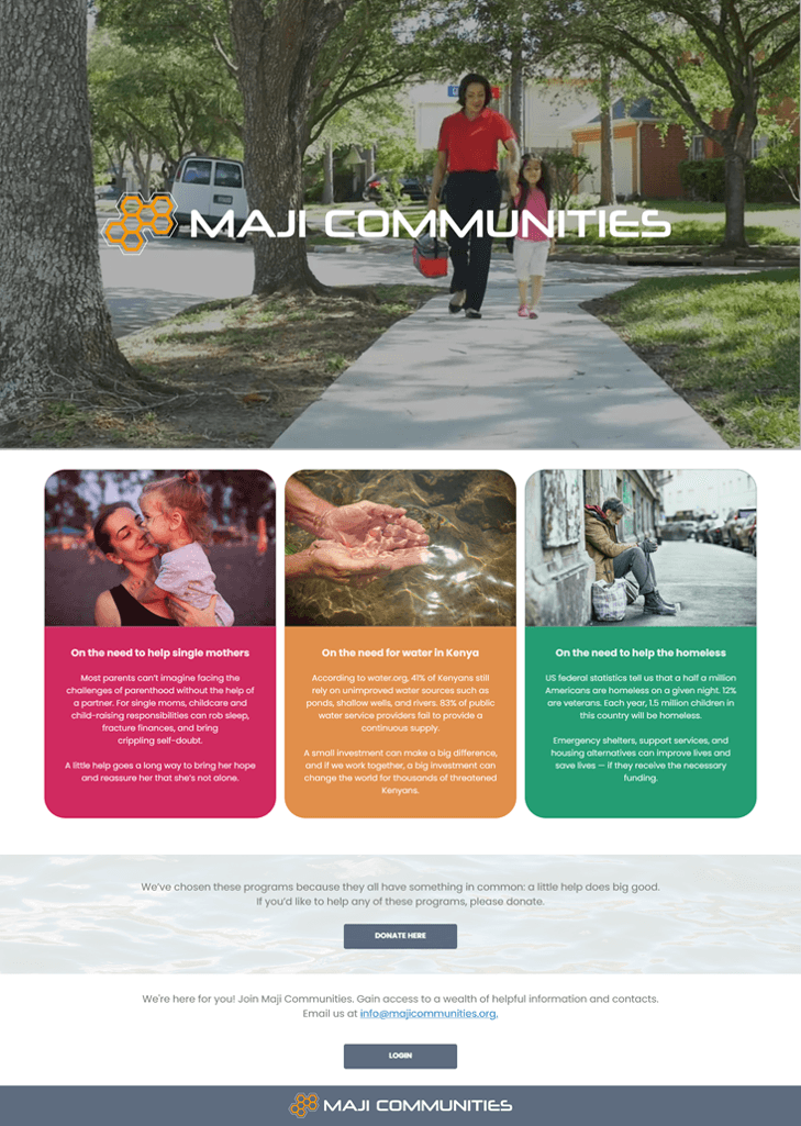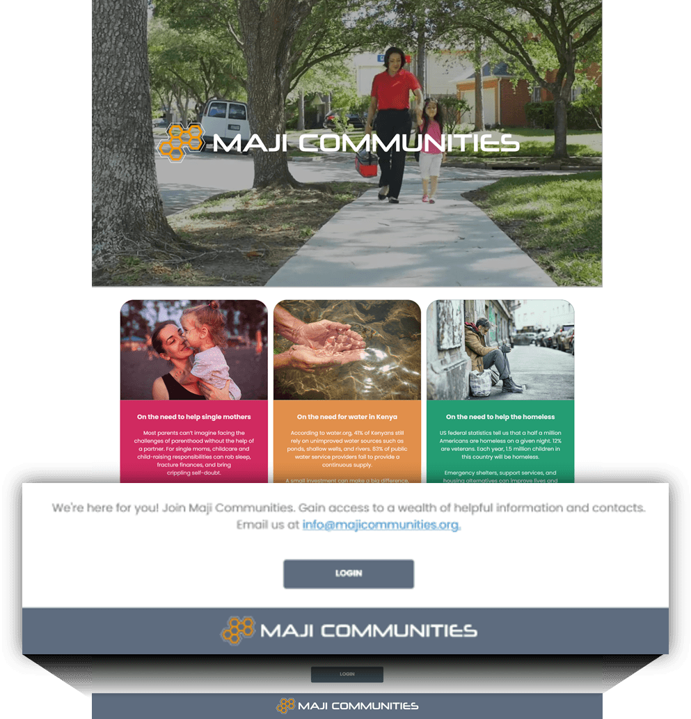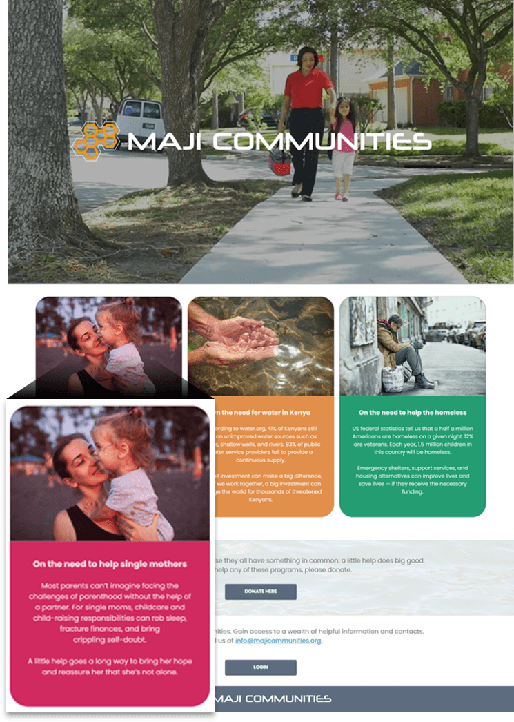The Maji Communities website provides the main structure for each city or organization’s single mom network, referred to as a “pod.” Moms will be granted membership to the community they belong to, then enter their name and password to access the community forum. Non-users are unable to post or view materials on the password-protected portions of the website.
