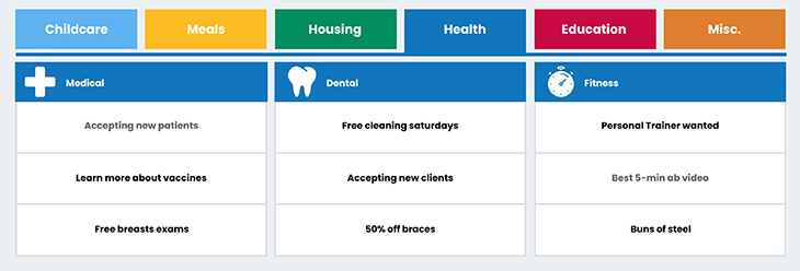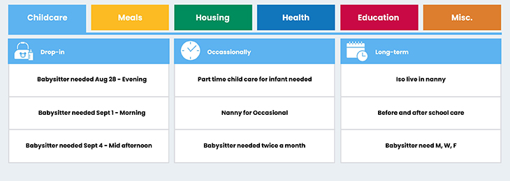 Community members can also sort discussion topics, set custom profile fields, and manage visibility levels for content. Topics include: Meals, Health, Housing, Childcare, Education, and Miscellaneous, with room for additional topics as the communities grow. Contributions from users can be moderated and promoted as needed.